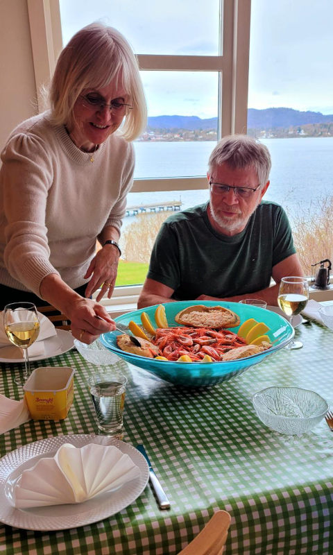 Ingrid is a marvelous cook. Per Magne pours an excellent glass of wine.