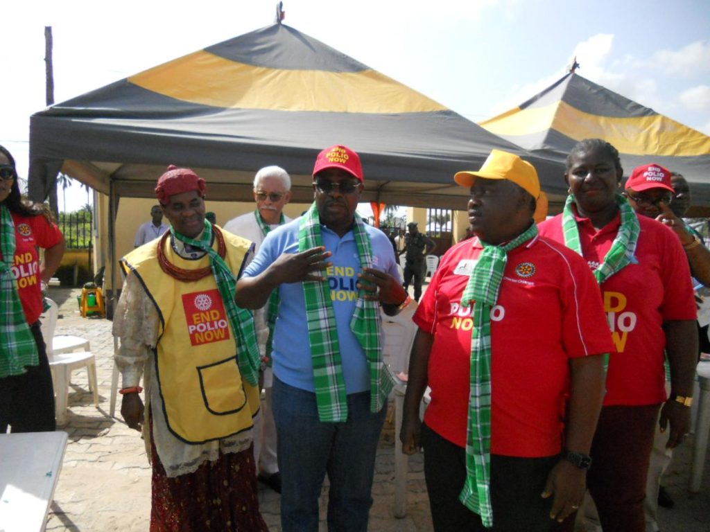 Rwanda market during a visit to Kigali with RI President Ravi RavindranSir Emeka and Adaora Offor at the Houston ConventionThe House of Friendship at the Bangkok Convention was the most beautiful of them all, filled with orchids and with special cultural experiences in every corner.In Nigeria with Trustee Chair DK Lee, hosted by Sir Emeka Offor. I participated in a polio immunization day, holding infants in my arms to deliver the drops.When I retired in 2023, I suggested that my team and I go out for a quiet drink. Instead my boss, Eric Schmelling, opened his house for a Ri-wide dinner celebrating David Bender’s and my retirement.